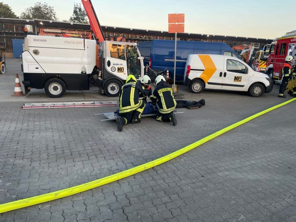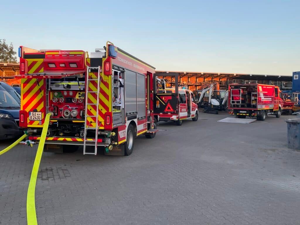 Nur wenige Minuten später trifft die zum Glück umgehend von Werkstattleiter Carsten Hegebarth alarmierte Feuerwehr mit mehreren Zügen und 16 Einsatzkräften der Wachen Alten-Buseck und Trohe ein. Routiniert gehen die Mannschaften in perfekter Abstimmung gegen das augenscheinliche Chaos vor Ort ein, bringen Ruhe in die Situation, den Herd der Rauchentwicklung unter Kontrolle und alle Mitarbeiter der Niederlassung in Sicherheit.