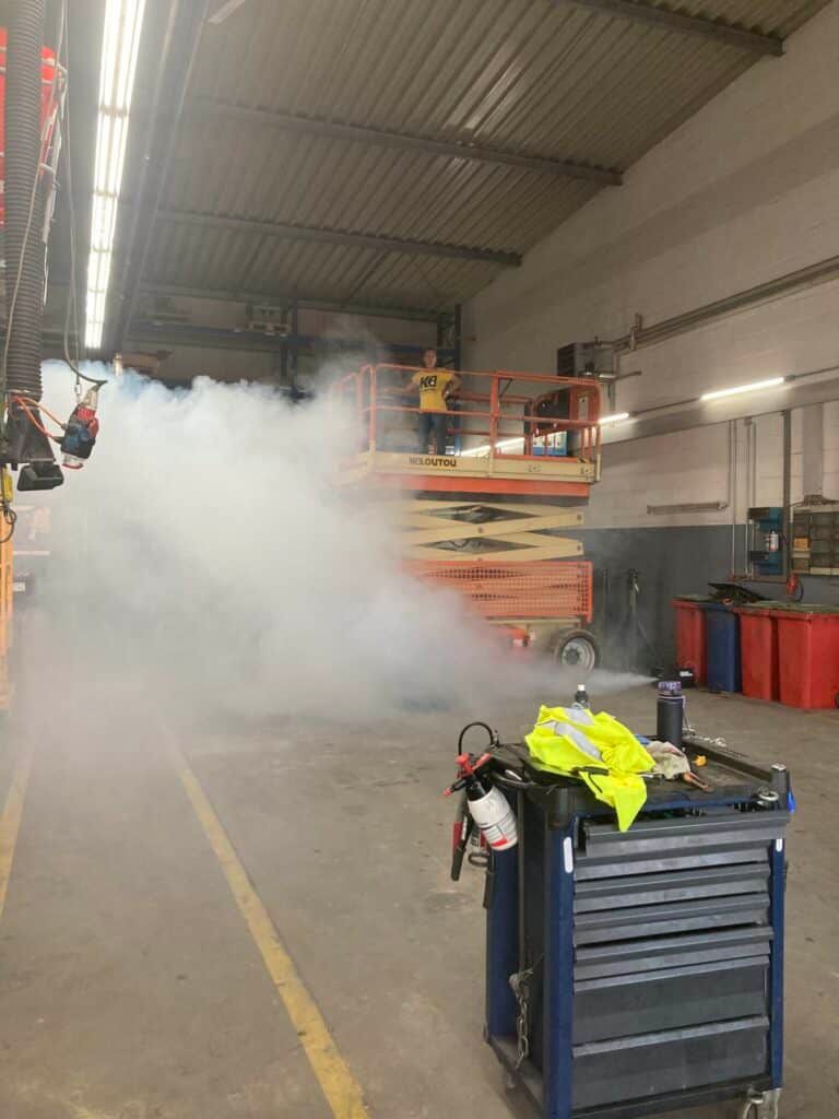 Denn einerseits bot KILOUTOU den ortsansässigen Wehren die Möglichkeit, in einem „Sonderobjekt“ und realistischen Szenario den Ernstfall zu proben. Nämlich in einem Umfeld mit besonderen Gefahrenquellen, wie Lacken, Lösungsmitteln und Batterien sowie Arbeitsplätzen mit weiteren hochentzündlichen Materialien.
