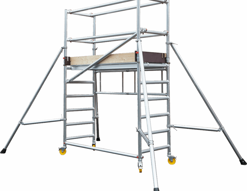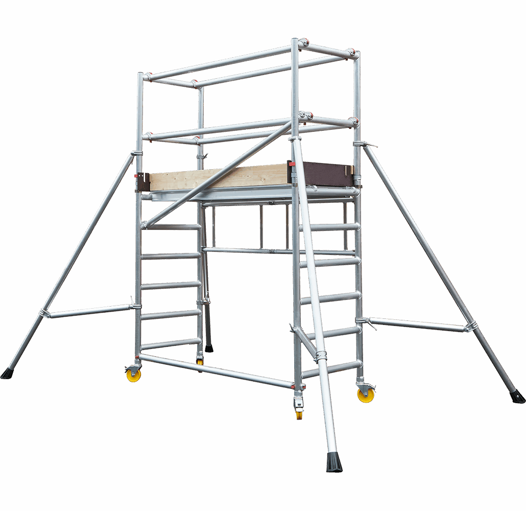 Este andamio ligero de aluminio es fácil de mover en cualquier obra. Se compone de una base plegable sobre ruedas con frenos, una plataforma con trampilla, 4 barandillas y 2 quitamiedos, un juego de zócalos y estabilizadores. Permite trabajar con seguridad a alturas de hasta 3,7 m (con el suelo a una altura de 1,7 m) en una amplia plataforma de 1,4 m². La plataforma puede soportar una carga máxima de 200 kg, incluyendo personal y equipos o materiales.