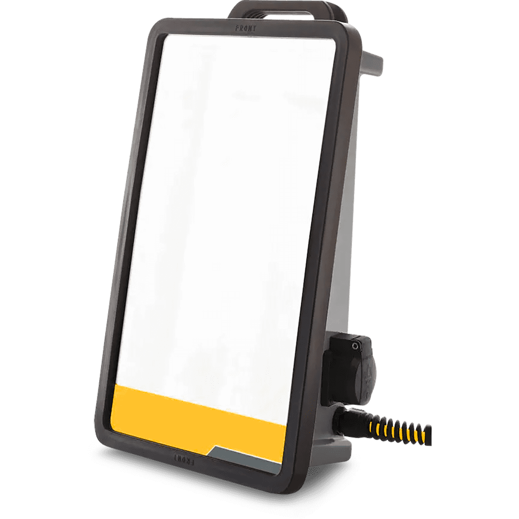 Este foco monofásico de interior con trípode ilumina hasta 150 m² gracias a sus 500 W de potencia. También puede equiparse con tubos fluorescentes (según el modelo).