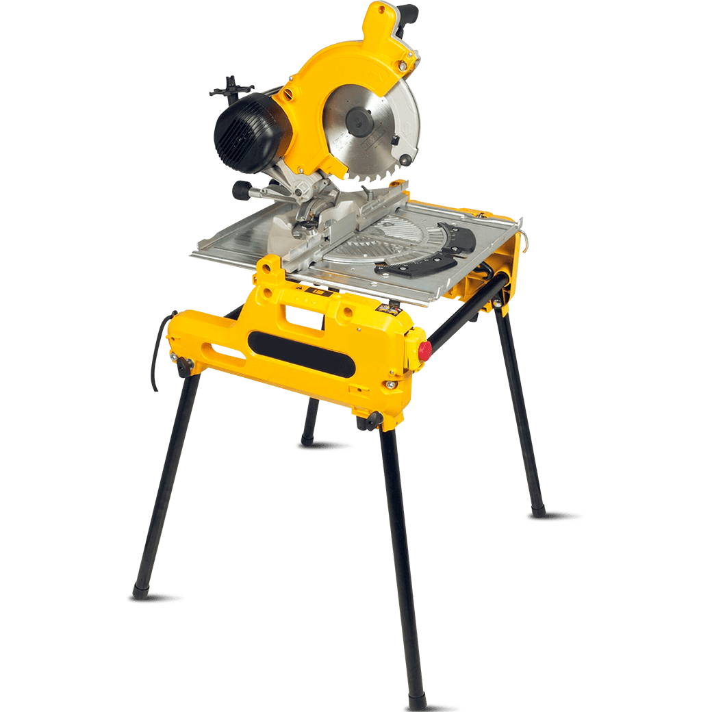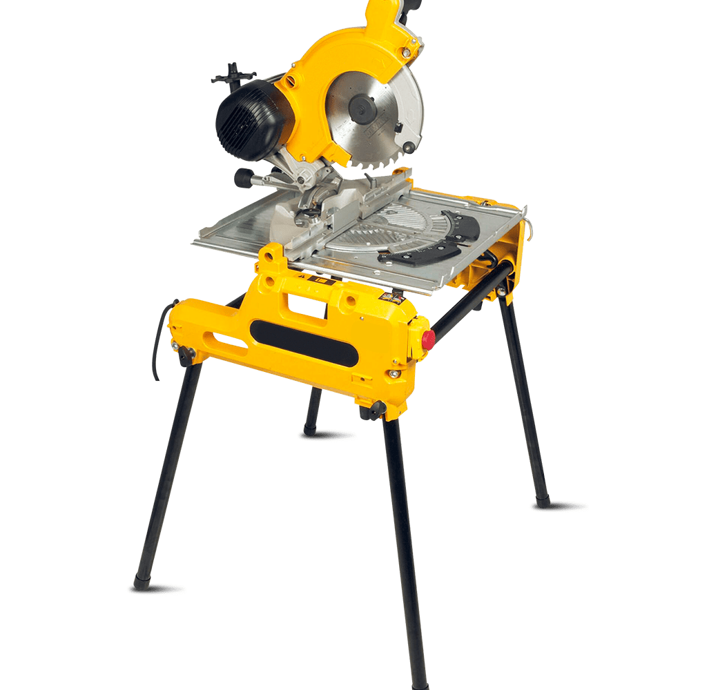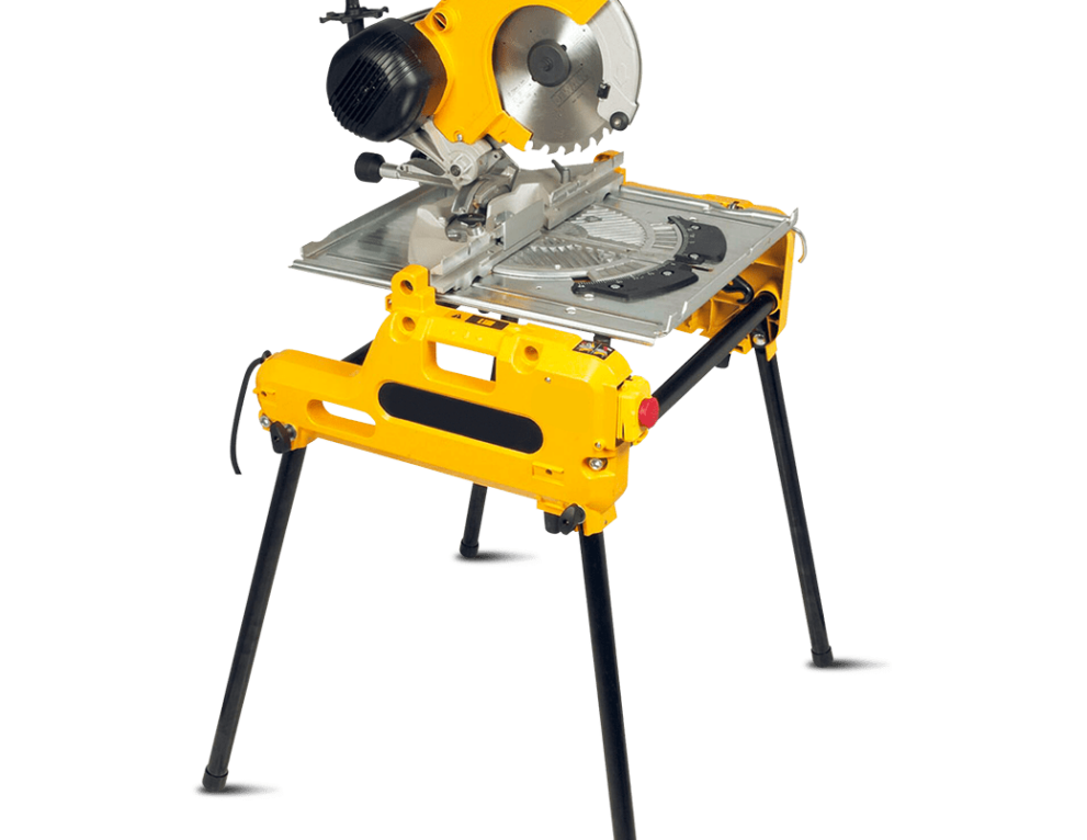 Esta herramienta, que combina sierra de mesa, sierra pendular e ingletadora, se puede desmontar para facilitar su transporte. El cabezal puede girar hasta 90° (de 0 a 45° a izquierda y derecha en función de las posiciones de enganche). Realiza cortes rectos, en bisel o transversales.