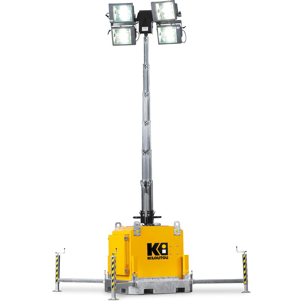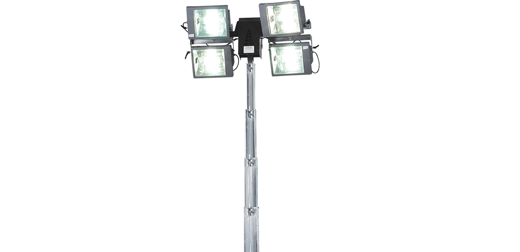 Mástil de elevación telescópico hidráulico hasta 8,2 m de altura con 4 proyectores de halogenuros metálicos de 1000 W cada uno.
