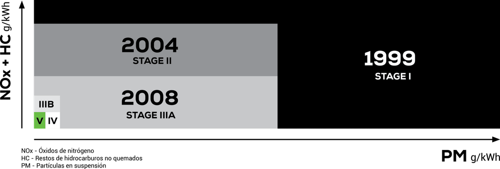 La reducción impuesta al pasar de Stage IV a Stage V se dirige principalmente a las emisiones de partículas. Se trata de reducir no sólo la masa de las partículas contaminantes, sino también la cantidad de las mismas.