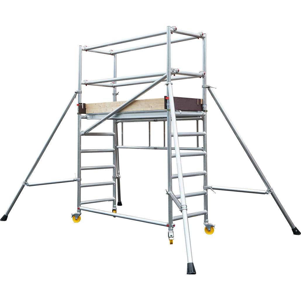 Costruita in alluminio, può essere montata e smontata velocemente da un operatore e garantisce un passaggio attraverso porte di 75 cm e di lavorare in spazi ristretti. Installabile su diversi livelli, ha una classe di carico di 204 kg/mq max. I 4 stabilizzatori permettono di lavorare in sicurezza.