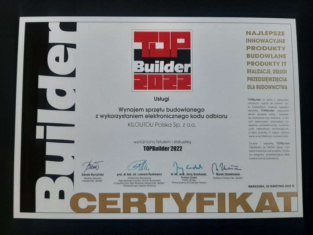 Kiloutou Polska decyzją kapituły Redakcji i Rady Naukowej Buildera otrzymało nagrodę TopBuilder 2022 w kategorii Usługi za „Wynajem sprzętu budowlanego z wykorzystaniem elektronicznego kodu odbioru”.