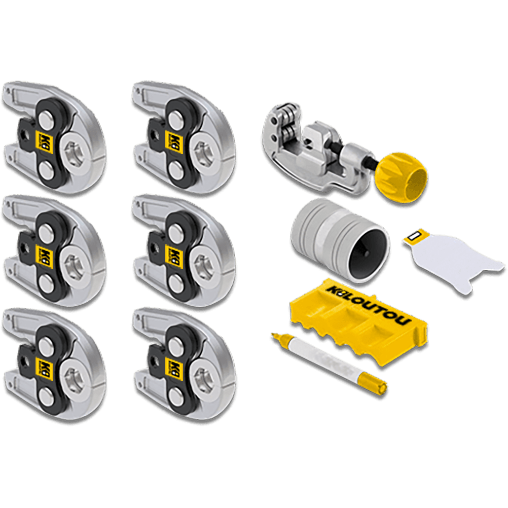 Cęgi zaciskowe (pierścienie zaciskowe) o dużej obciążalności z kutej, ciągliwotwardej i odpowiednio hartowanej stali specjalnej. Kontury zaciskowe są specyficzne dla każdego systemu i odpowiadają konturom poszczególnych systemów zaciskowych. Zapewnia to bezproblemową zgodność i pewne zaciskanie. Narzędzia te służą jako podstawa do zatwierdzenia instalacji.