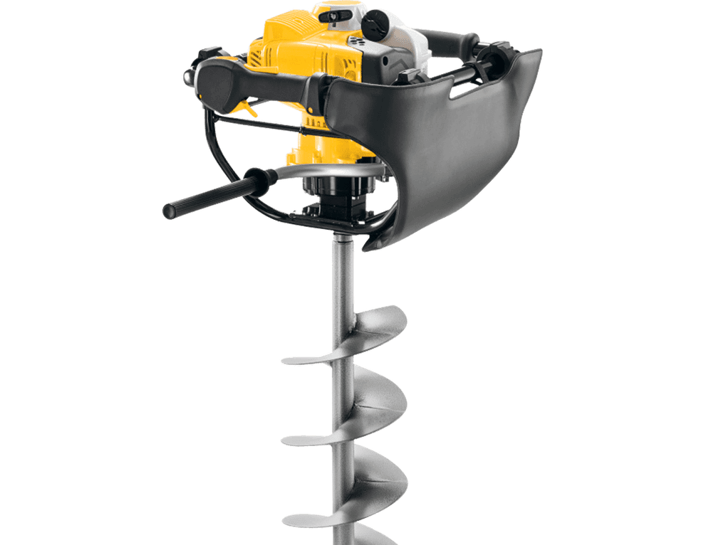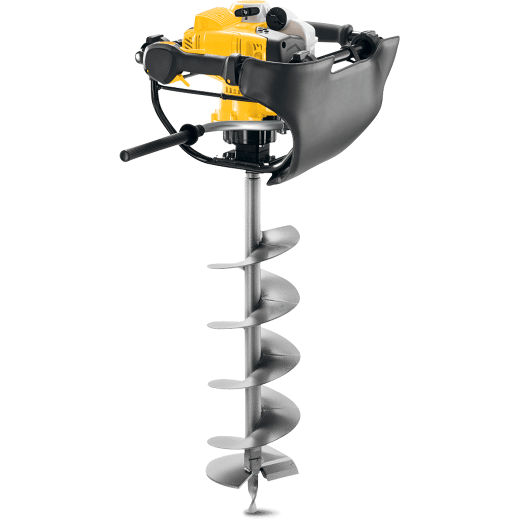 Jednoosobowy świder glebowy z hamulcem wiertła. Profesjonalne narzędzie z dużym zbiornikiem paliwa, ramą amortyzującą, uchwytem obsługowym z przyciskiem STOP. Wiertnica do nawiercania otworów o średnicy do 300 mm